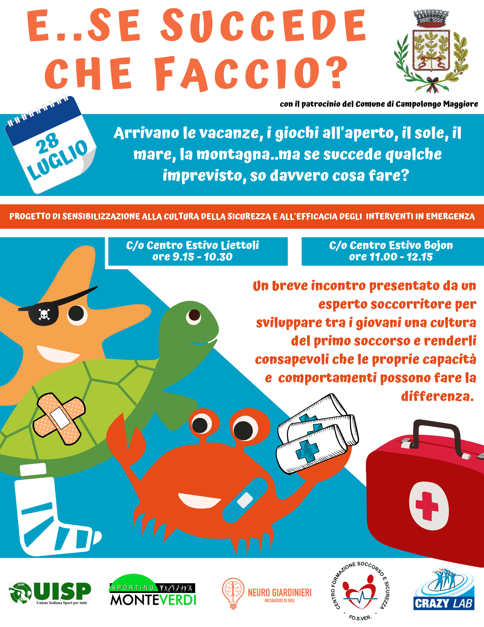 Neuro Giardinieri in collaborazione con Crazy Lab e Fo.s.Ver , con il patrocinio del Comune di Campolongo Maggiore, organizza 2 incontri di introduzione al primo soccorso per bambini presso i Centri Estivi di Liettoli e Bojon. E’ un progetto che Neuro Giardinieri propone alle scuole e ai centri ricreativi d’infanzia per promuovere la sensibilizzazione alla cultura della sicurezza e all’efficacia degli interventi in emergenza.